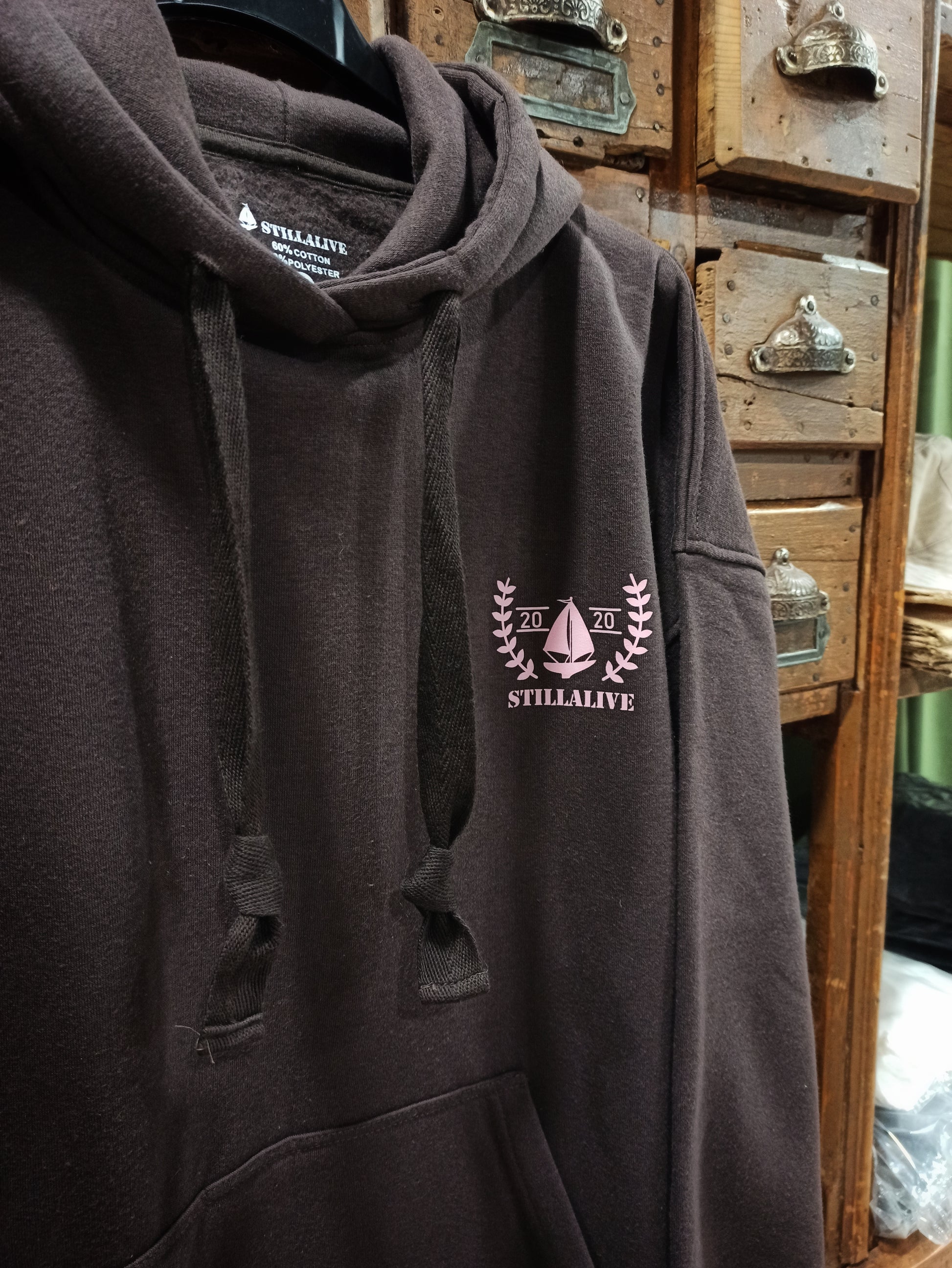 Sudadera con capucha. Talla única oversize. Color marrón chocolate con estampado de logo en rosa.